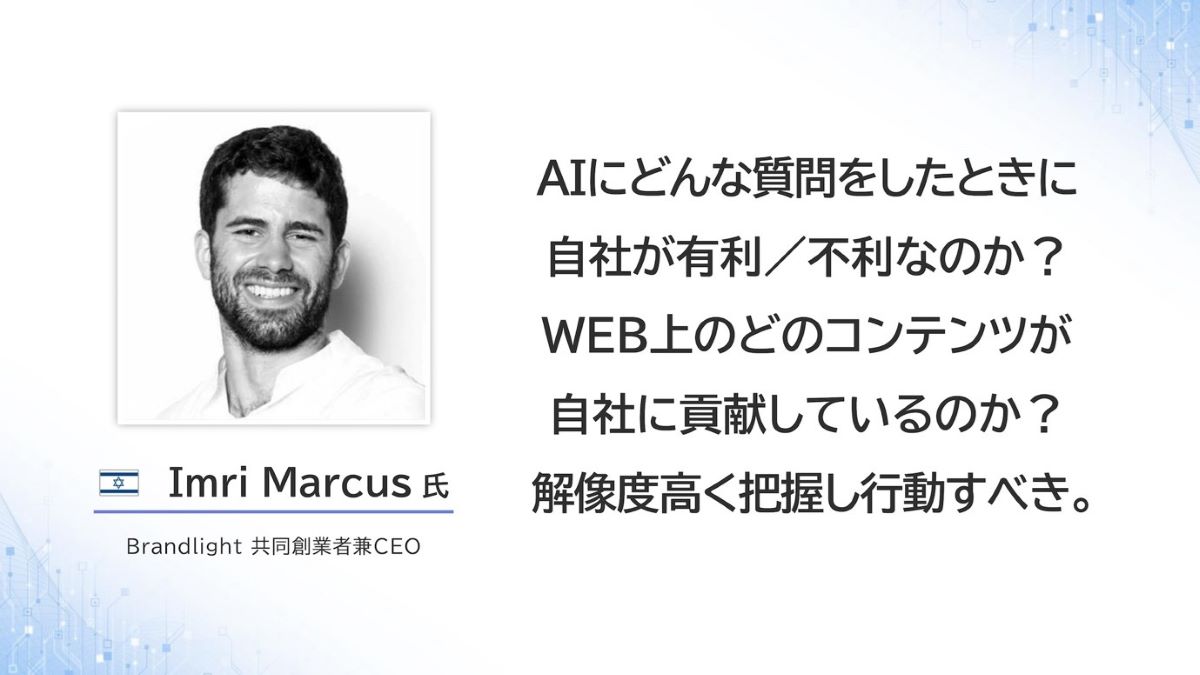 では、生成AIというメディアに選ばれるために、企業側は一体何をすべきなのでしょうか。次に話を聞いたのは、Brandlight CEOのImri Marcusさんです。