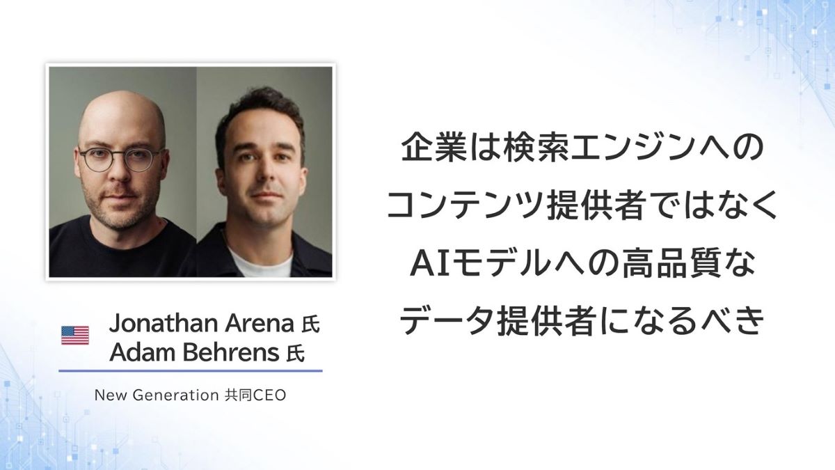 では、現状を把握した上でどんな情報をどうやってAIに向けて発信すればいいのでしょうか。この点については、New Generation創業者の2人に聞きました。ブランドサイトやECサイトのAI最適化を専門とし、450万ドルのシードファンディングを達成したアメリカのスタートアップです。