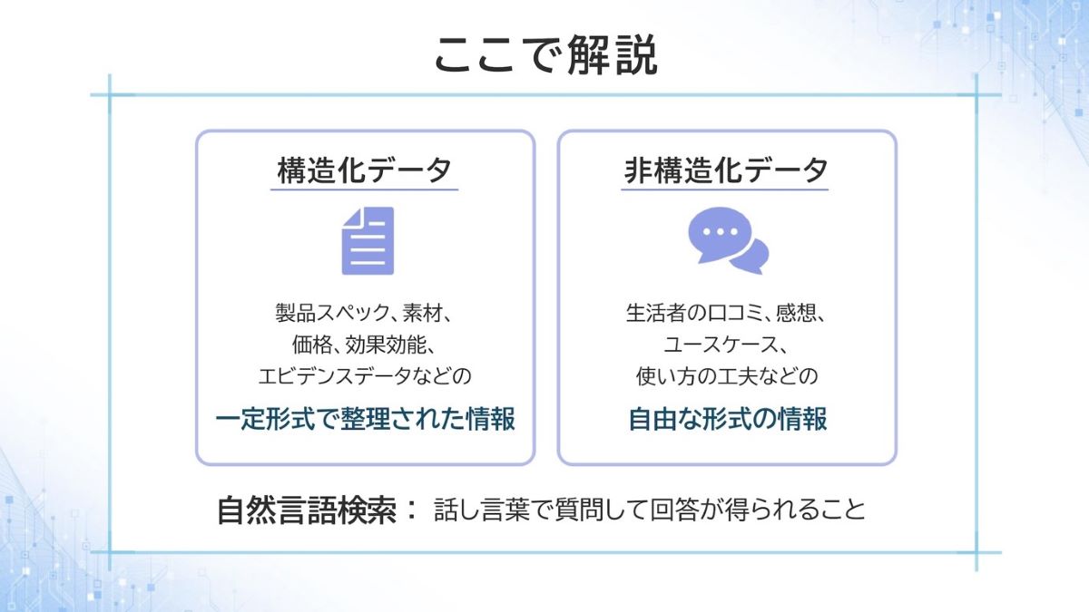 1つ目は「構造化データ」。製品のスペックや素材、価格、効果効能など、一定形式で整理された情報です。スペック表や諸元表などの整理の仕方と同じ、とご理解ください。