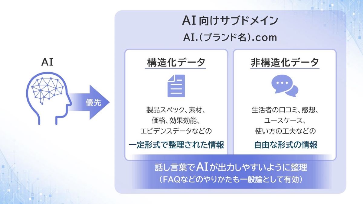 まとめると、AIが話し言葉(自然言語検索)で出力しやすいよう、製品の基本情報である「構造化データ」と、より人間的な「非構造化データ」を、AIが扱いやすい形式に整えてパッケージ化する。さらにそのデータを、今ある自社サイトではなく、AI向けのサブドメインに格納する。