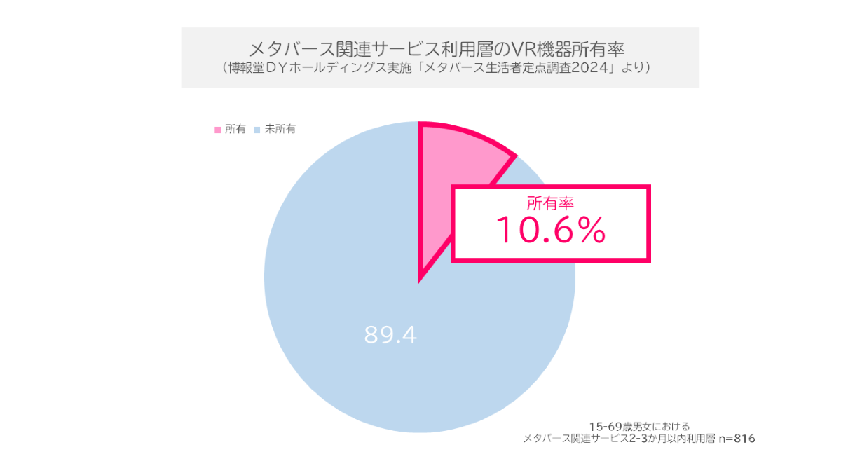 博報堂DYホールディングスが実施した「メタバース生活者定点調査2024」でも、メタバース利用層におけるVRゴーグル所有率が約1割にとどまるという結果になっていました。