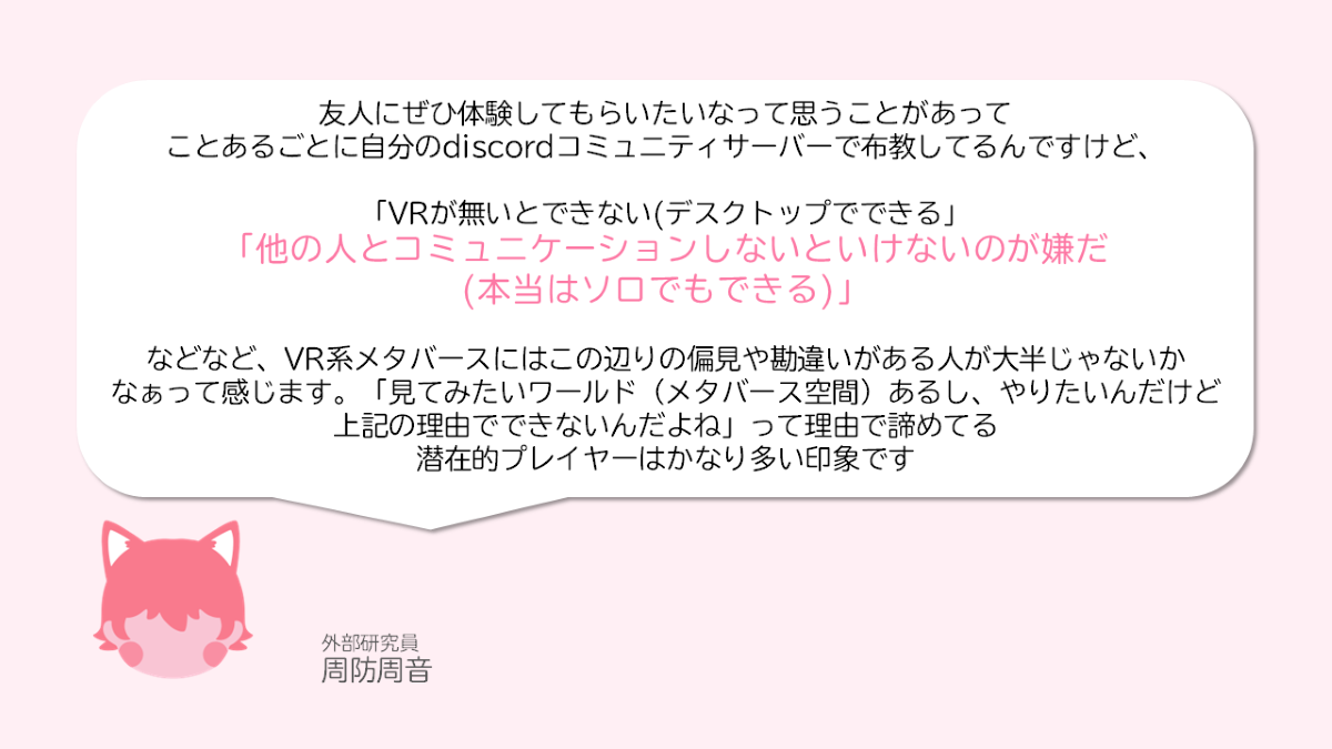 先ほど述べたようなメタバースプラットフォームでは、設定や自身のスタンス次第では実は1人でも十分に楽しむことができるのですが、これも多く知られていない印象がありそうです。