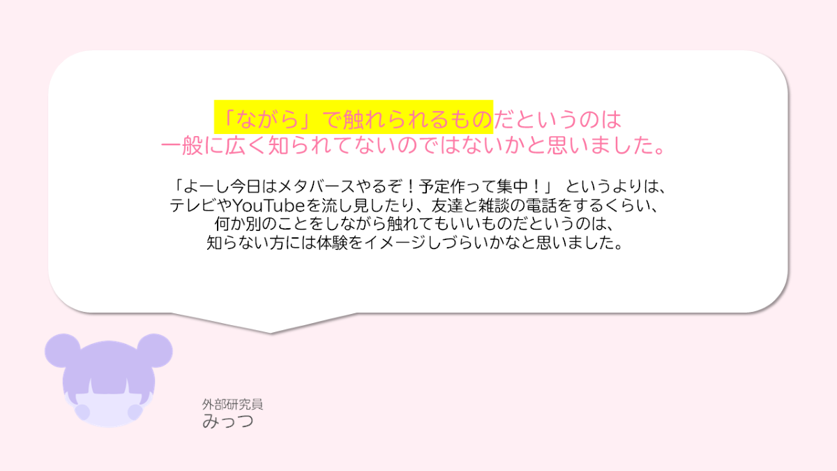 これまで述べたように、実はメタバース空間はVRゴーグルがなくても体験できたり、一人でも楽しめたり、気軽に参加できる側面を持っています。だからこそ、「やるぞ!」と集中しないと楽しめないものではなく、「ながら」でも楽しめます。