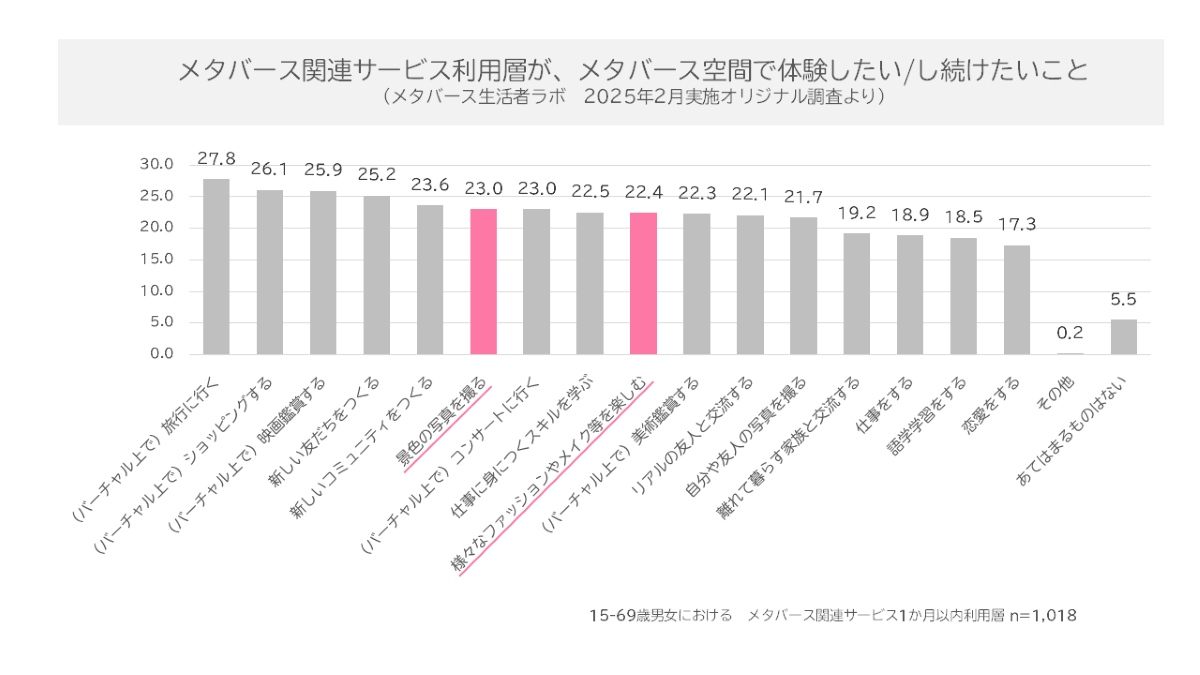 実際にメタバース生活者ラボが2024年2月に実施した調査でも、「メタバース空間で体験したい/し続けたいこと」として、「景色の写真を撮る(23.0%)」「様々なファッションやメイク等を楽しむ(22.4%)」など、他人との交流を前提しない体験をあげる人も多くいました。