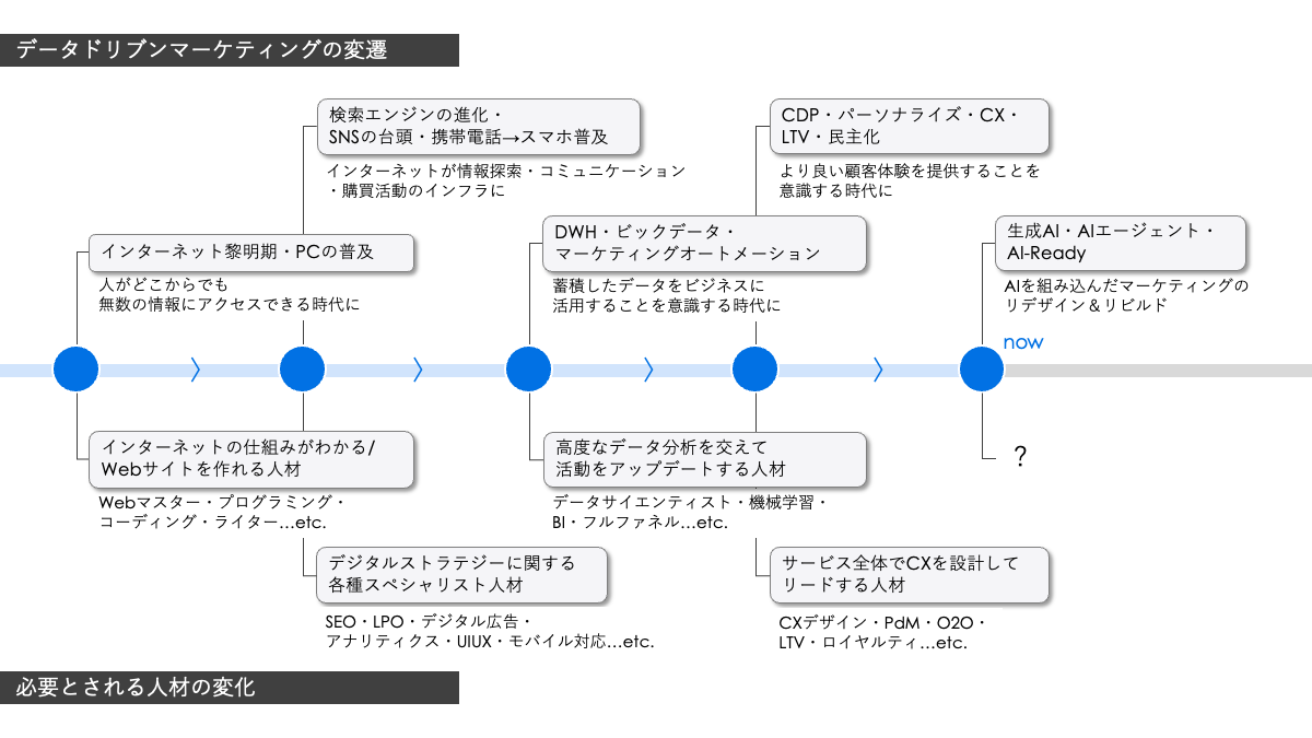 データ活用と一言で言っても、その姿は時代と共に大きく変化してきました。テクノロジーの進化と、それに伴いマーケターに求められるスキルの変遷を振り返ってみたいと思います。