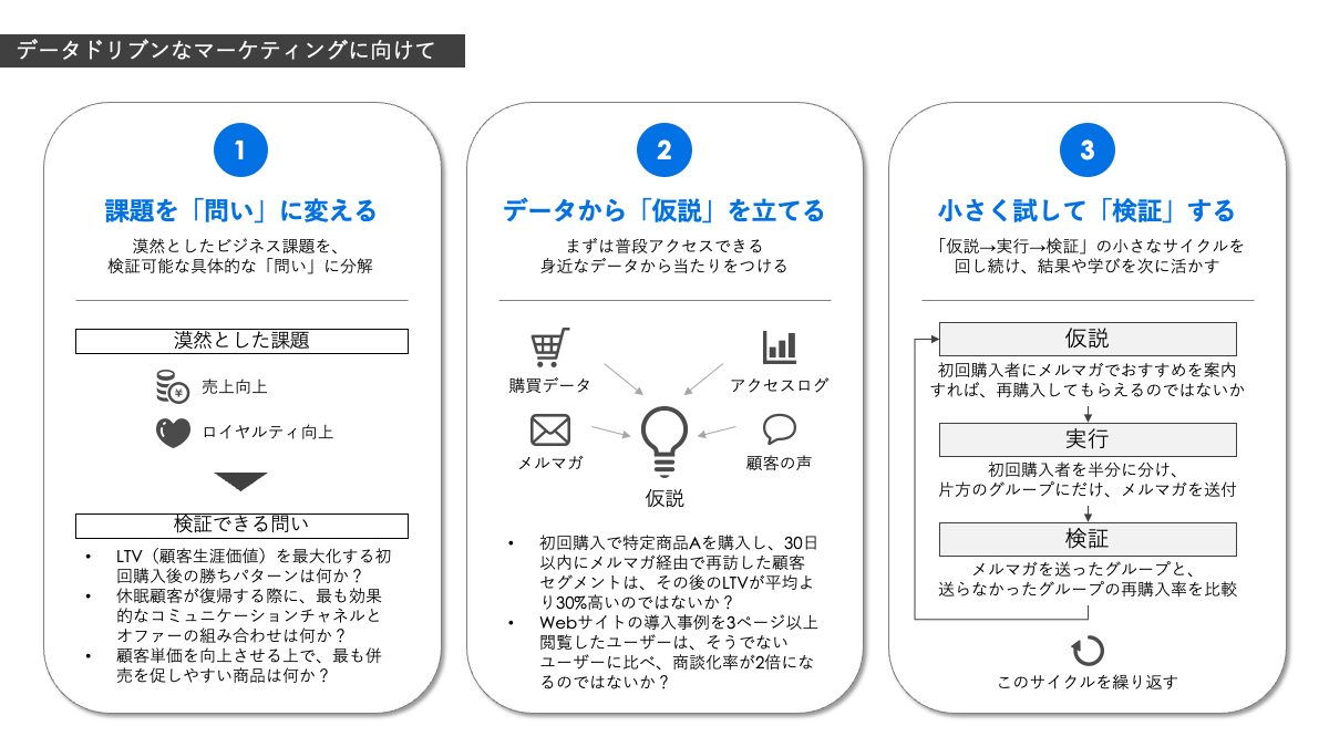 では、データドリブンなマーケティングを始めるために、具体的に何から手をつければよいのでしょうか。「データ活用」と聞くと、高度な分析ツールや専門知識が必要だと身構えてしまうかもしれません。しかし、その第一歩目はシンプルで、大切なのは、「問い」を立てることから始めることです。
