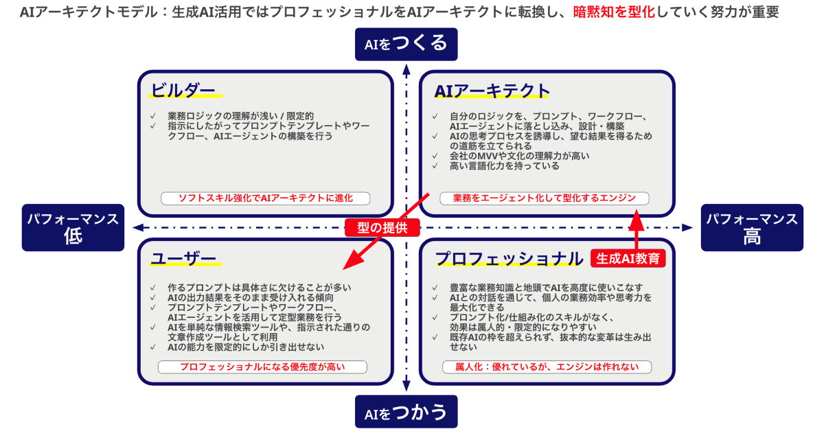 後者は、直接AIスキルを教えるのではなく、ビルダーがプロフェッショナルを指導し、結果的にプロフェッショナル自身がAIアーキテクト寄りの役割を担うようになるという発想です。