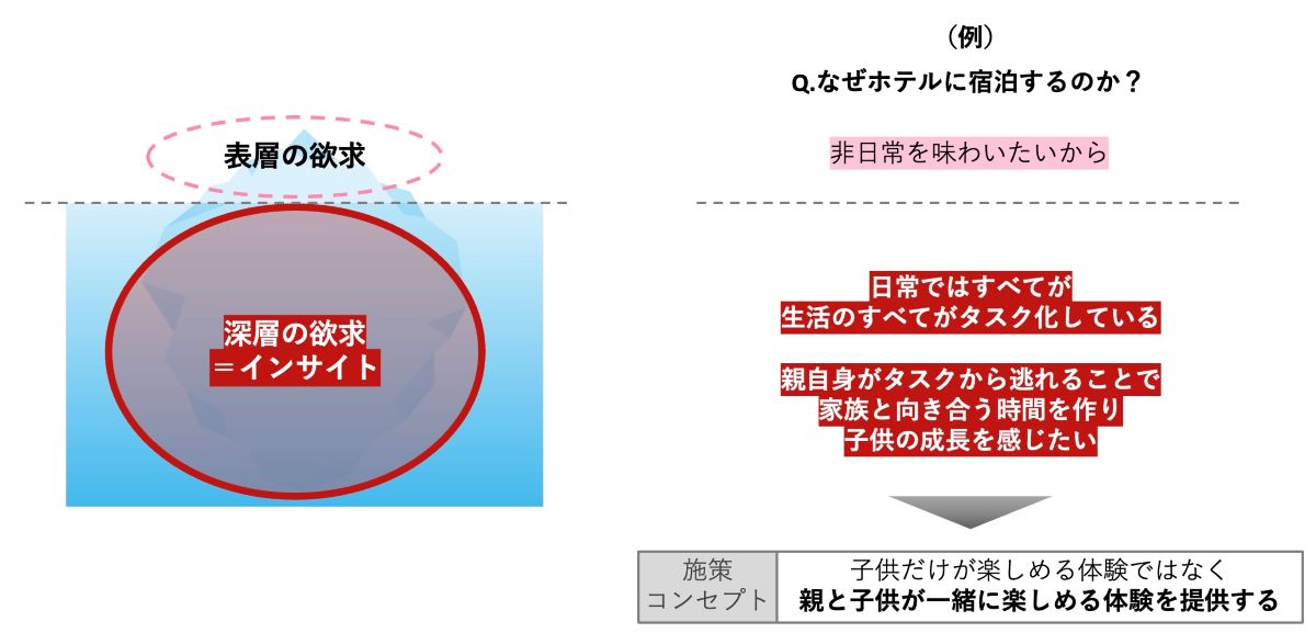 例えば、ある顧客がホテルに宿泊する理由を尋ねられて、「非日常を味わいたいから」と答えたとします。これは「表層の欲求」です。しかし、その欲求をさらに深掘りしていくと、「日常のすべてがタスク化している。仕事や家事から解放されることで、普段なかなか向き合えない家族との時間を取り戻し、子供の成長を実感したい」という、より切実な「深層の欲求=インサイト」が見えてくるかもしれません。
