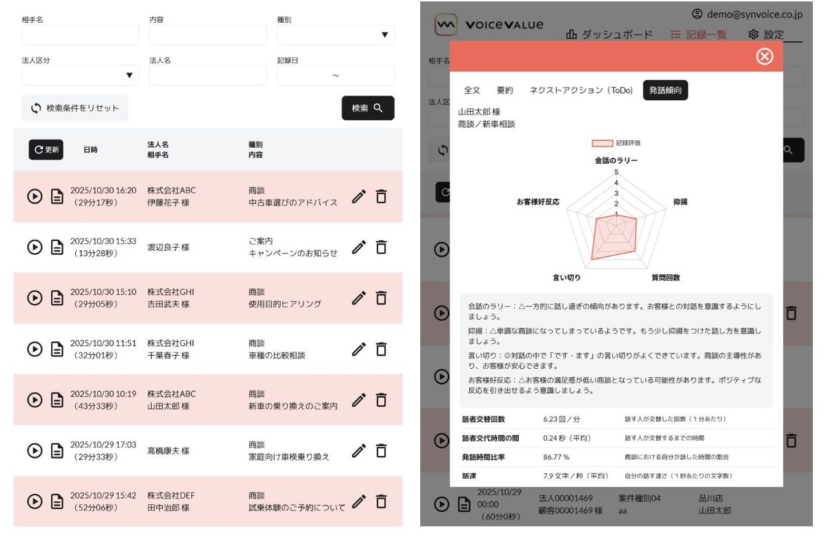 - 対面商談の評価や商談メモをAIで自動作成するアプリケーション「voice value」を紹介したいと思います。2025年1月から実際の販売現場の協力を得て実証実験を行い、その結果を踏まえアップデートする形で、2025年10月に本格提供を開始しました。このアプリは、スマホ・タブレットで商談を録音※するだけで、AIが商談内容を分析・評価し、営業担当者の成長を可視化します。また、商談記録やメモを自動作成するので業務効率が向上し、均質なスタッフ育成と営業機会の獲得に貢献します。
