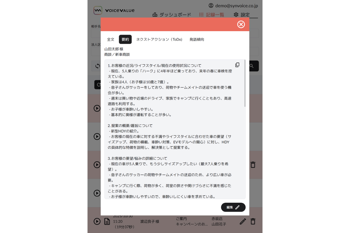 - そう思います。正直、商談のテキスト化や要約だけなら、もう汎用的なAIで実現できるかと思います。博報堂SYNVOICEが目指しているのは単なる要約ではなく、本部と現場の垣根を超えた企業体として、顧客への提供価値を高めていくことです。