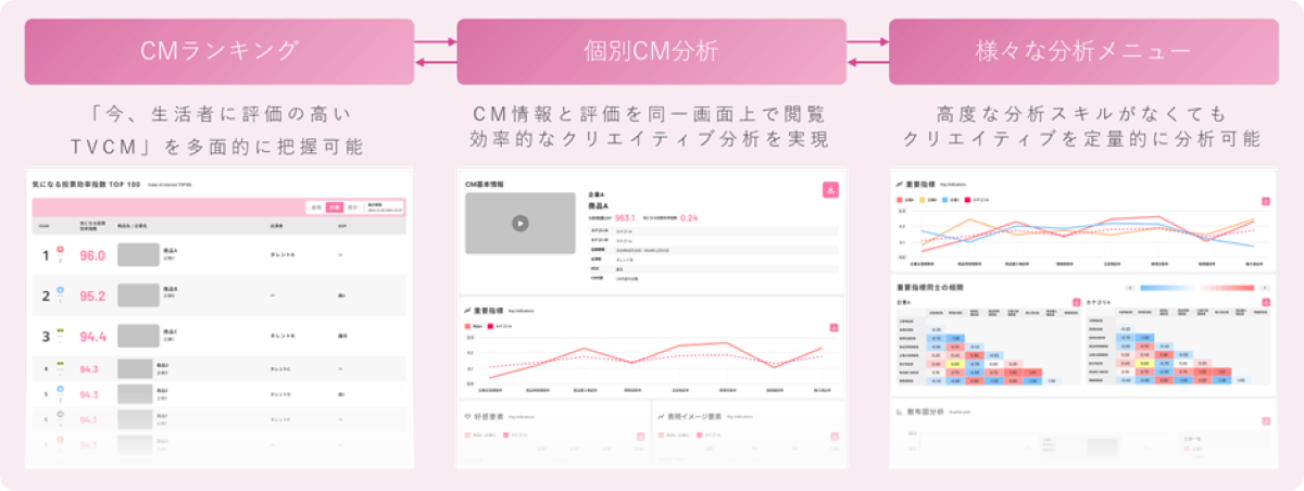 - 「CMランキング」「個別CM分析」「豊富な分析メニュー」の3つが主な機能です。
