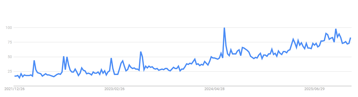 そして、そんな慌ただしい時期に、よりにもよってスマホの調子が悪く、買替えを検討しています。そこでちょっと気になっているのが、いわゆるdumb phone(ダムフォン)。ご存知の方も多いかもしれませんが、少し説明させていただきますと、dumb phoneは “おばかケータイ”といった意。なぜおばか呼ばわりかというと、通話やメール、アラームといった基本的な機能のみのシンプルでロースペックな携帯電話だからです。下記検索数のグラフからも分かる通り、世界的には、下記検索数のグラフからも分かる通り、2024年の春ごろから現在まで注目が増していることが分かります。
