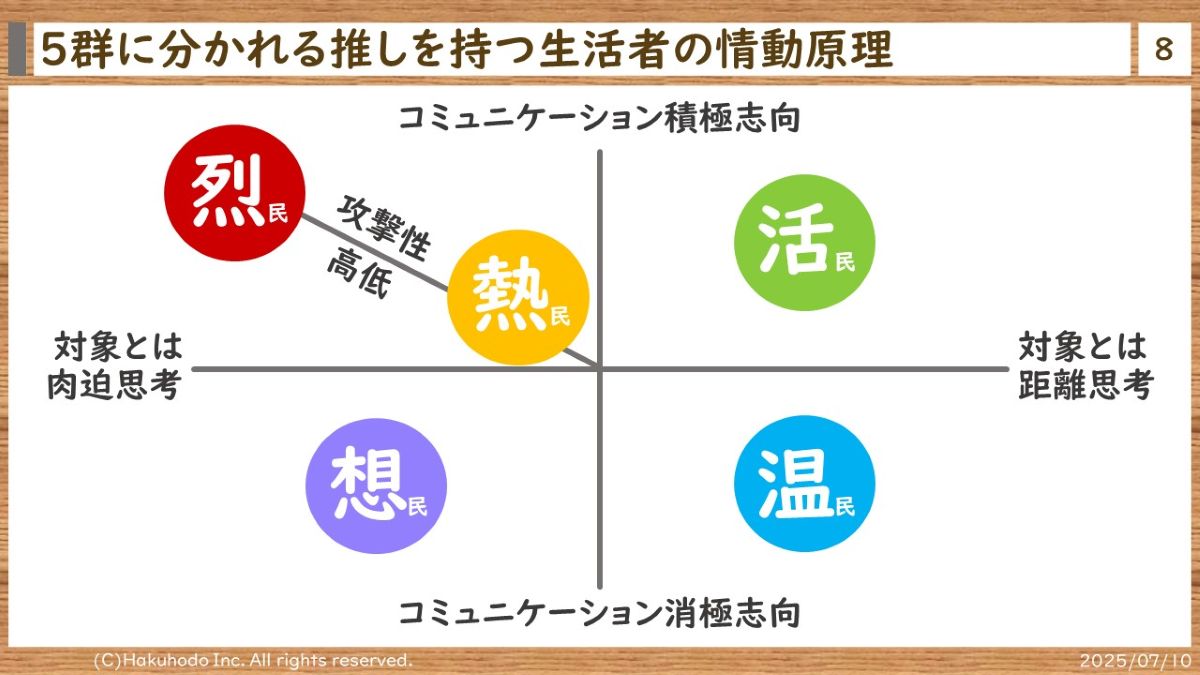 烈(れつ)民: いわゆる「強火勢」。布教や距離を詰めることに熱心で、正義感が強く攻撃性も高い層です。