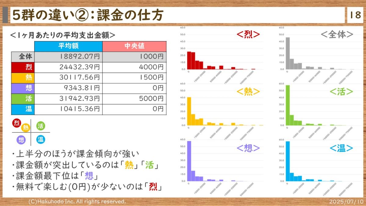- 定義によると思いますが、先ほどの分析でいうと、平均課金額は半年間で18万なので、スーパーファンといいつつも定義としてはおそらくそこまで高額の課金額を想定してはいな いと思っています。とはいえ、「烈民」「熱民」「活民」が入り混じった集団であることは確かで、そこをどう分類しどうバランス取っていくかというのは、テーマとして面白いと思いました。