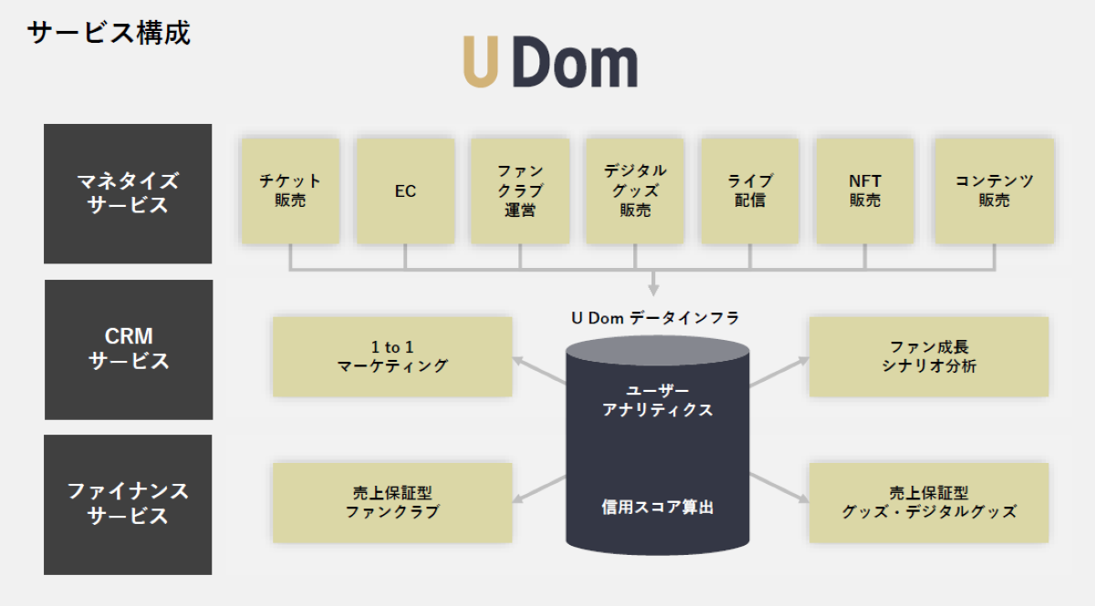 - まさにおっしゃる通りです。その上で、具体的なサービス構成としては、まずはチケット販売、EC、ファンクラブ運営など1つ1つのマネタイズポイントを統合的に提供するマネタイズサービス。また、データを1箇所に集めることで提供できるCRMサービスがあります。そして、データ分析をベースに資金のリスクを取っていくサービスという3軸で構成しています。