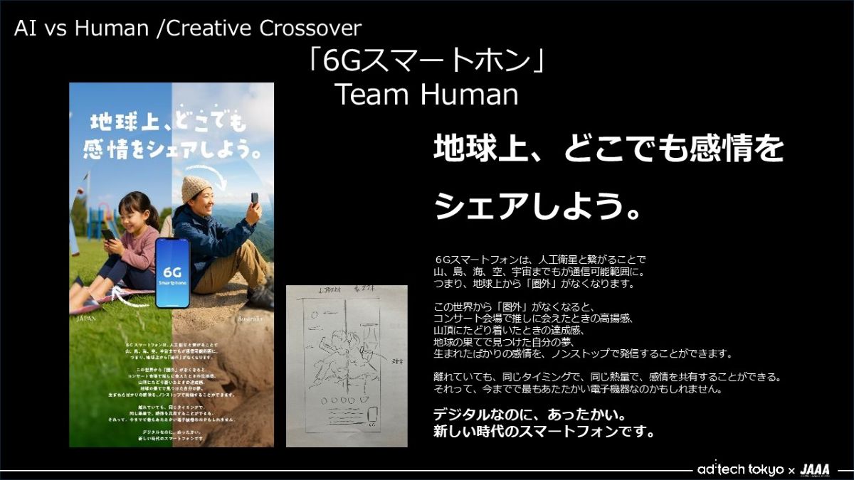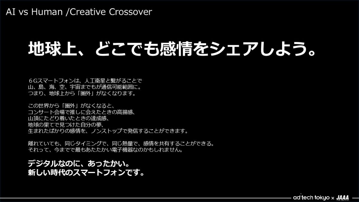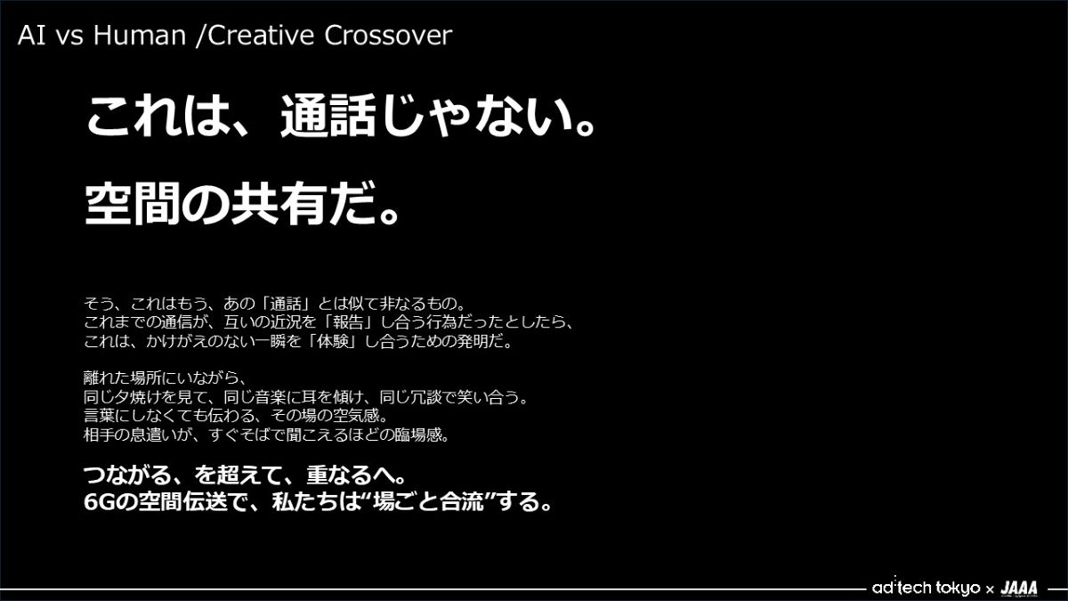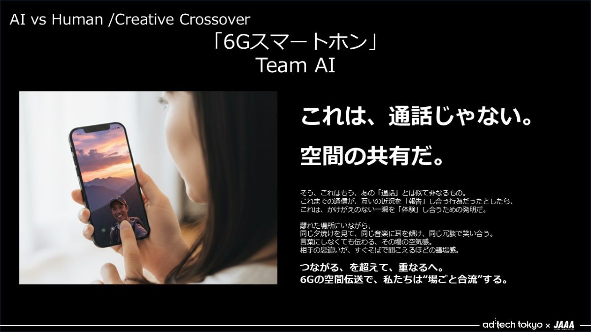 - 最初に6Gに関する紹介文を調べると、BtoBでどう変わるかというものが多かったので、「ユーザーにとって何がいちばんの価値なんだろう」と2人で議論をしました。そこから、今見ている景色を空間ごと共有できる、みたいなのはおもしろいよねという話になり、それを一言で表せるコピーをAIと探りました。