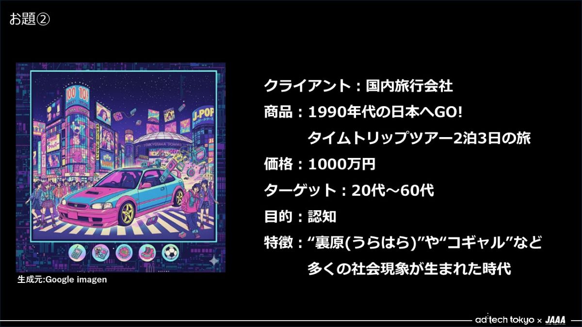 - では2つ目のお題です。「1990年代の日本へGO! タイムスリップツアー2泊3日の旅」の認知を獲得してください。……登壇してくれている5人は、90年代をリアルタイムで過ごしていないと思いますが、80年代のいわゆるバブルがはじけて、いろいろなカルチャーが生まれた時代ですね。そこをどうポイントにするかを見てみたいなと思って、こんなお題になりました。
