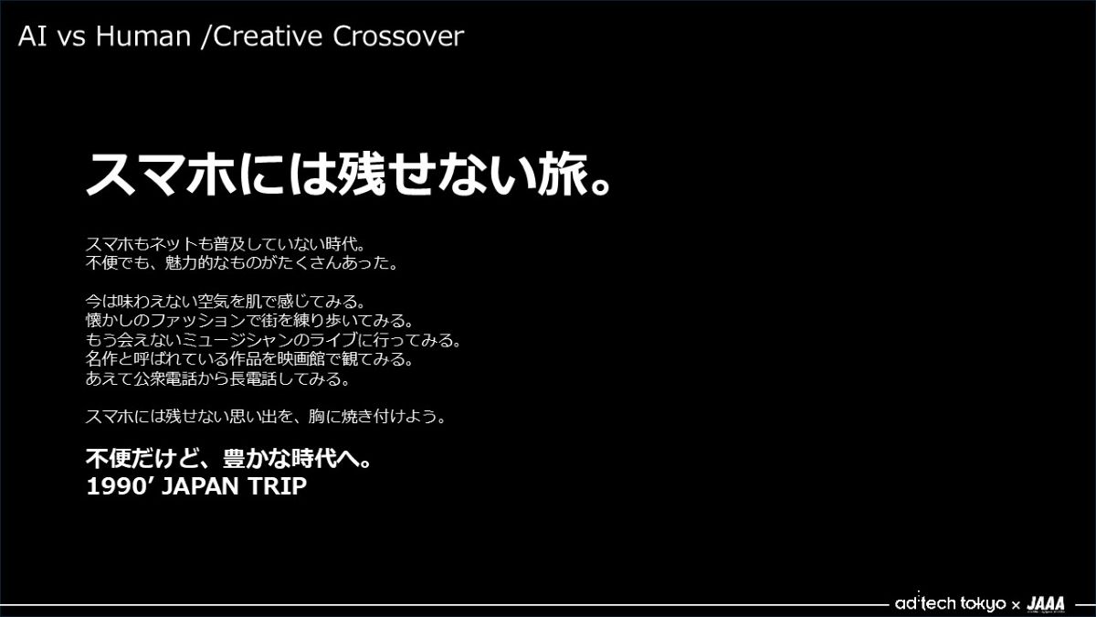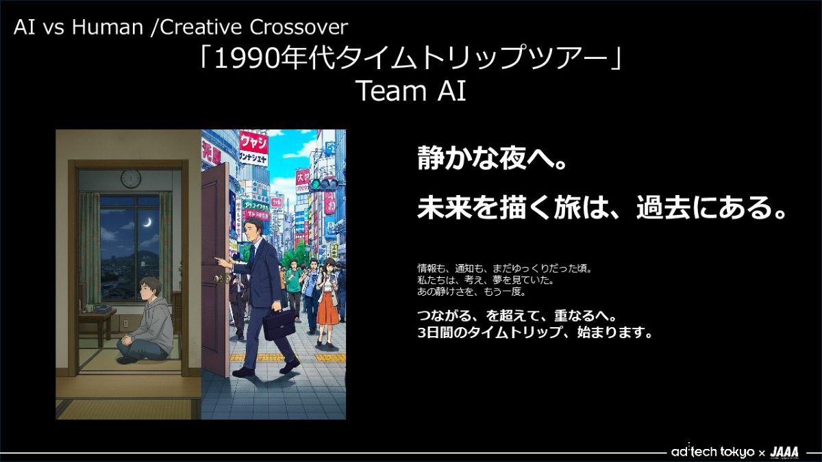 どちらのチームだったか、クリエイティブとともに明かしますと、まず①がチームAIの案でした。これはどのように発想したんでしょうか?