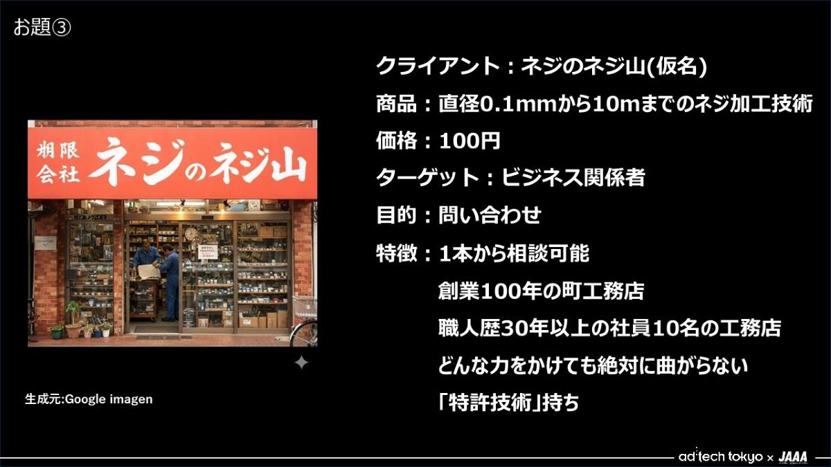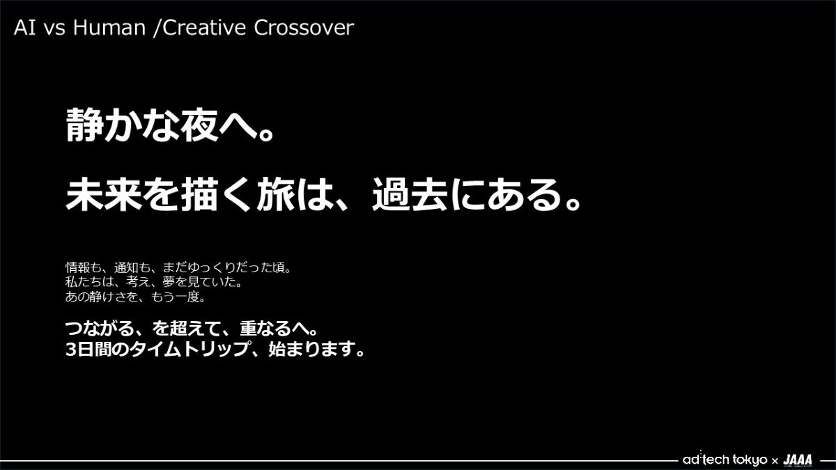 - ありがとうございます。さて、お題は3問あります。すべてAIへのプロンプトで作成するチームAIは2時間、人力によるチームHumanは3時間内で、コピーとボディコピー、デザインまでを制作しました。ただし、チームHumanのデザインはラフスケッチまでとし、追ってAIも部分的に活用しながら改めて仕上げてもらいました。勝敗は昨年同様、会場の皆さんの拍手の大きさで決めたいと思います。