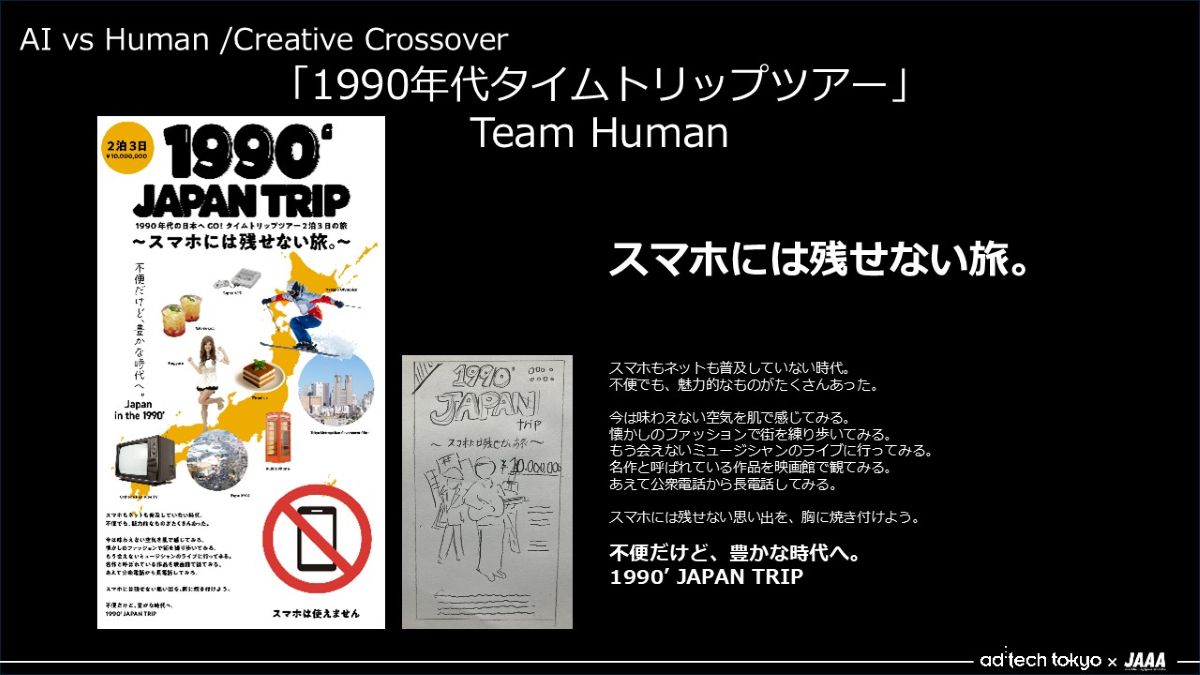 昨年のad:tech tokyoでは、あらかじめ生成AIで考えたコピーに対し、若手クリエイターたちがこの場で考えたコピーとどちらが良いかを競った結果、若手の皆さんの圧勝に終わりました。そのセッションの反響がとても大きく、第2弾をやらせていただくにあたり、今回は「若手同士で対戦してもらおう」という考えで、「チームAI」と「チームHuman」に分かれてクリエイティブに臨むことになりました。