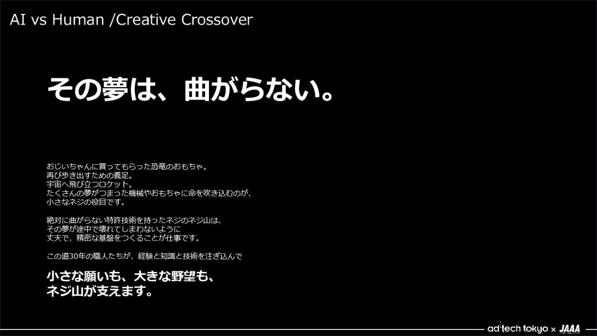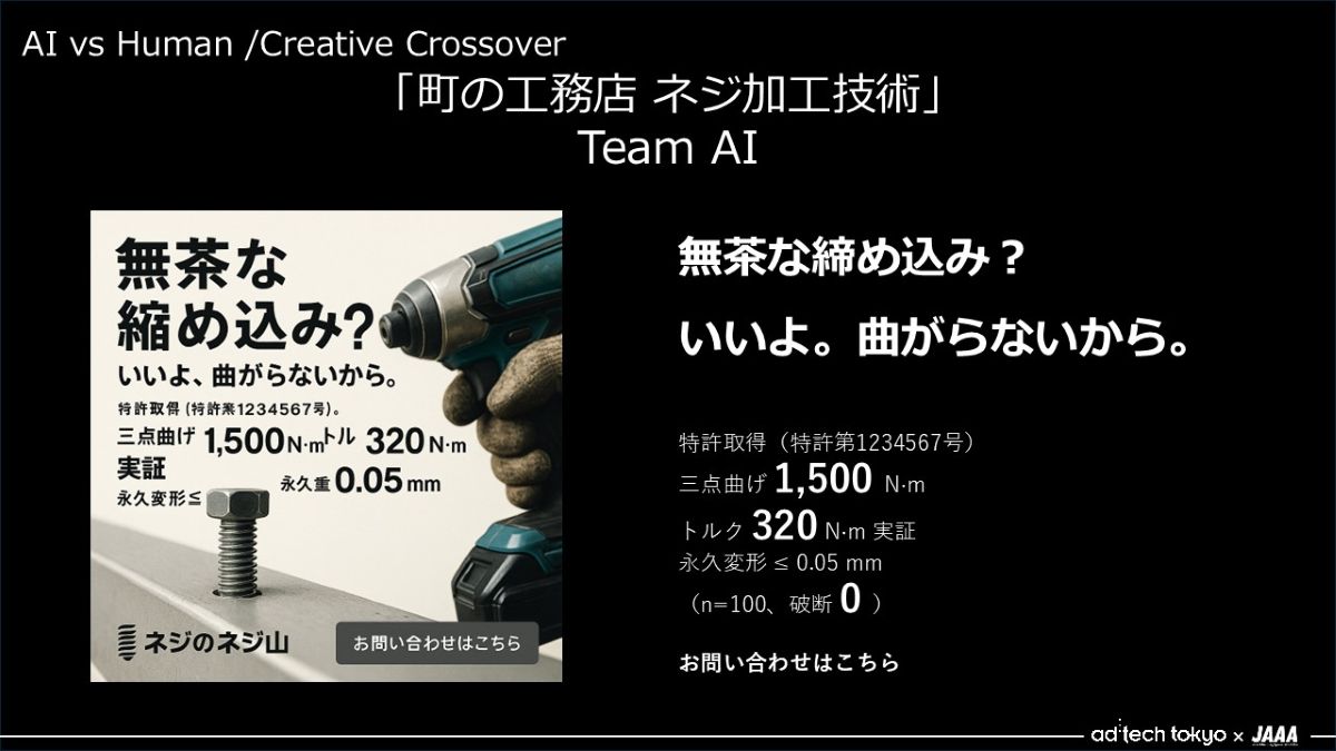 - これは、①の勝利ですね。こちらを担当したのはチームAIでした、おめでとうございます! このクリエイティブについて、教えてもらえますか?
