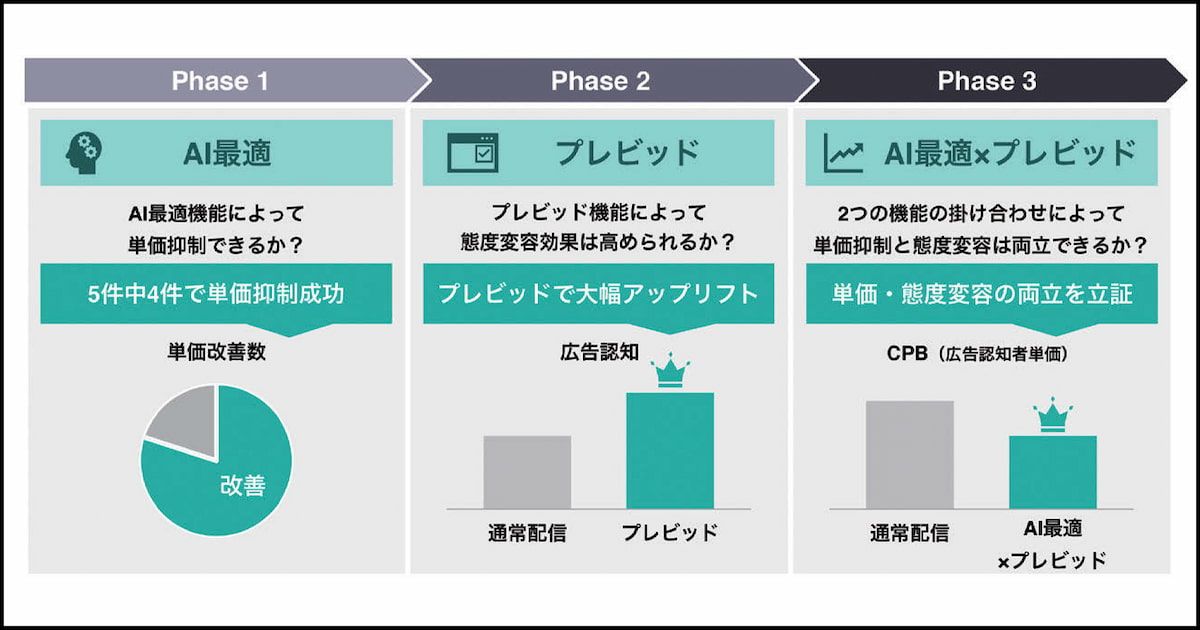 AI最適機能による単価抑制検証を皮切りに、プレビッド機能による態度変容効果向上検証、量と質向上策として「AI最適×プレビッド掛合せ」の計3回にフェーズを分けて検証を実施した。
