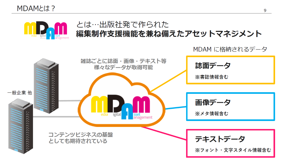 MDAMは2017年に集英社で開発された編集制作支援機能を兼ね備えたアセットマネージメントです。編集部や協業先の印刷会社、フリーのクリエイターなどがMDAMを通じて雑誌の誌面のやり取りや送稿に利用できるというもので、言わば雑誌のDX基盤になっており、導入する出版社や協業パートナーは年々増加しています。