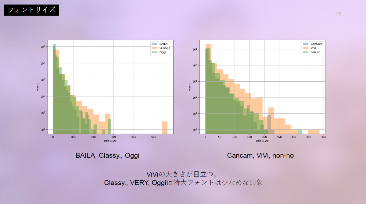 文字数を見ると、ミレニアル世代はZ世代と比較すると全体的に文字数が多めでした。フォントサイズは、Z世代3誌に特大のフォントが目立ったり、フォントのレンジが広いという特徴がありました。使用しているフォントも、ミレニアル世代3誌はスタイリッシュで洗練された印象、信頼性といった印象を与えるフォントが使われており、Z世代3誌は柔らかさや活気あるイメージの、モダンで若々しい雰囲気のフォントが使われていました。