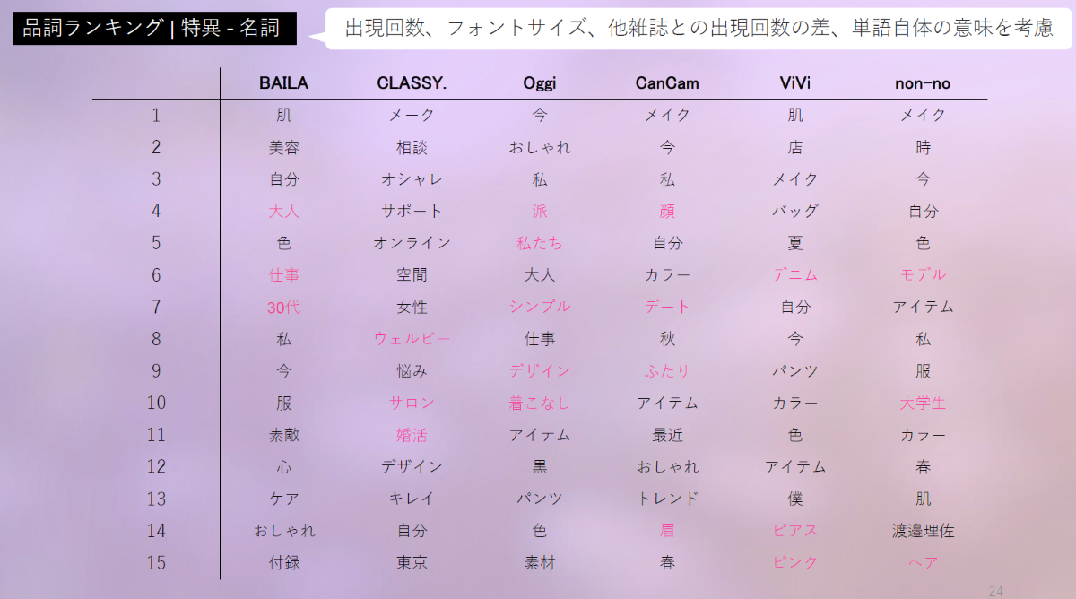 続いて6誌の違いをより浮き彫りにした分析をしてみます。 CanCamでは「綺麗」「飲む」「ご飯」など食生活の文脈で語られていたり、ViViでは「目標」「モデル」などストイック寄りな内容が書かれています。BAILA、non-noだと「下半期」「習慣」「続ける」など継続に関する文脈で語られていました