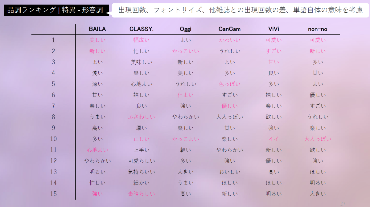 形容詞については、ミレニアル3誌で「心地よい」「ふさわしい」「ほど良い」「かっこいい」など、理想の姿を形容する形容詞が上位に来ています。一方Z世代3誌ではいずれも上位1位に「かわいい」があり、さらに「色っぽい」「甘い」「大人っぽい」など、「かわいい」のニュアンス違いの形容詞が上位に来ていました。