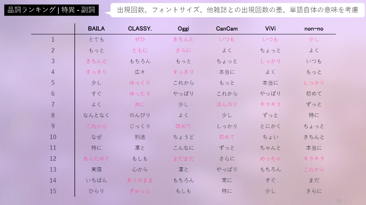 副詞については、ミレニアル3誌で、今の自分に合った理想の姿として「すっきり」「ゆったり」「きちんと」といった副詞が、Z世代3誌では、どうかわいいかを形容する副詞が上位に出てきました。「これから」「始めてみたい」など、若い世代が対象だからこそなのかもしれませんが、ライフスタイルの変化に関連した副詞が上位に出てきたのも特徴的です。