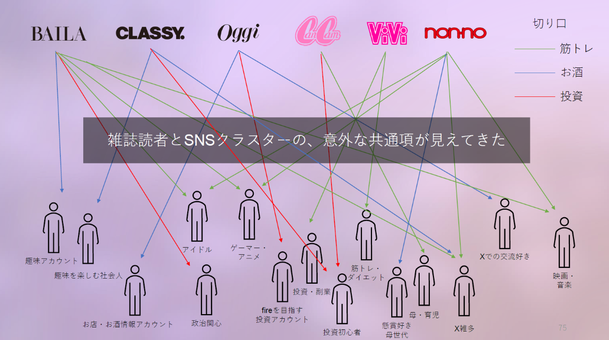 Xのデータと掛け合わせて見ると、Oggiの「引退後に不安を持つ社会人」とファイアを目指す投資アカウントが相性がいいとか、CanCam、CLASSYの「わかりやすく投資に関する知識を紹介」する文脈が、投資の初心者と相性がよかったり、BAILAの「投資に関する国の制度等への関心」があるクラスターが、政治関心クラスターと親和性が高いなどが見てとれました。