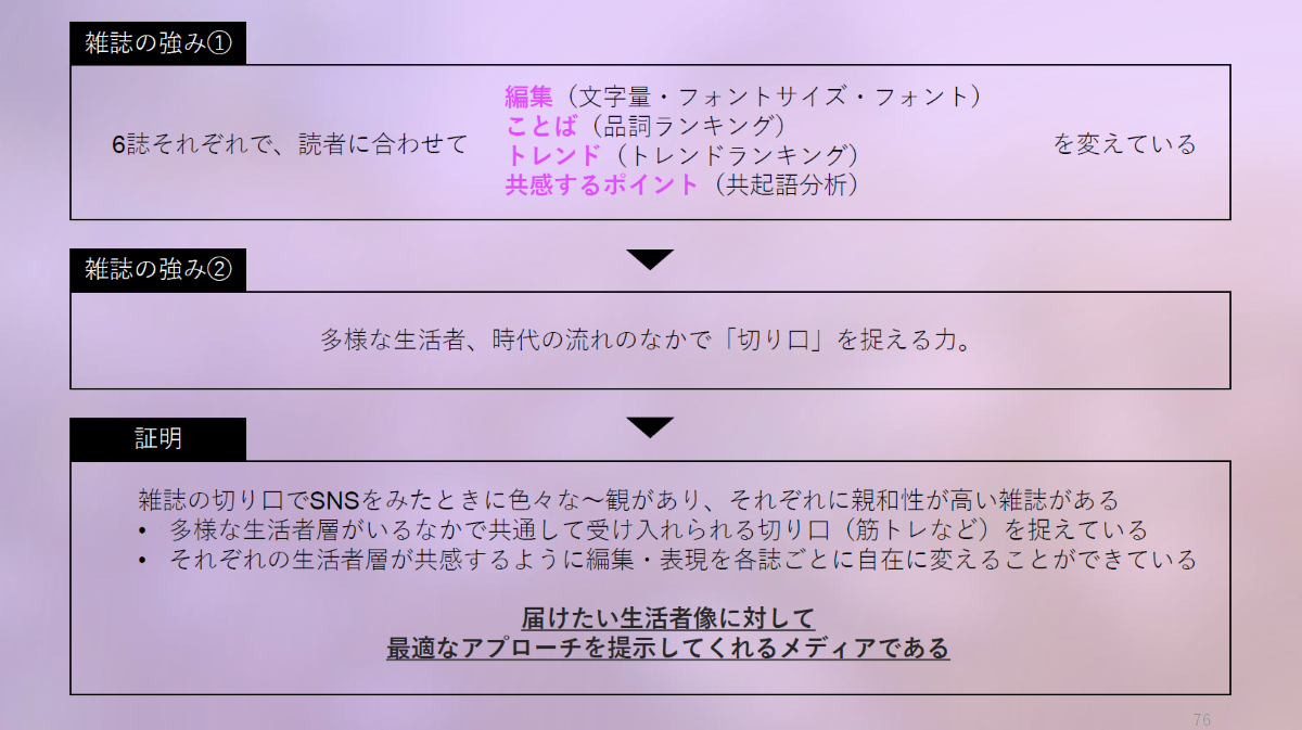 - 改めて、雑誌にはトレンドを生み出す力、信頼できるコンテンツ力、時代を切り取る編集の力があると言えます。その力とMDAMの掛け合わせで、商品開発やローンチキャンペーン、リブランディング、コミュニケーション策定など、上流の工程でもお手伝いできることがあるのではないかと考えています。 マーケターが普段感じている世の中の動きや仮説を可視化することで、非常に興味深い示唆を得られたという評価をクライアントからいただけました。