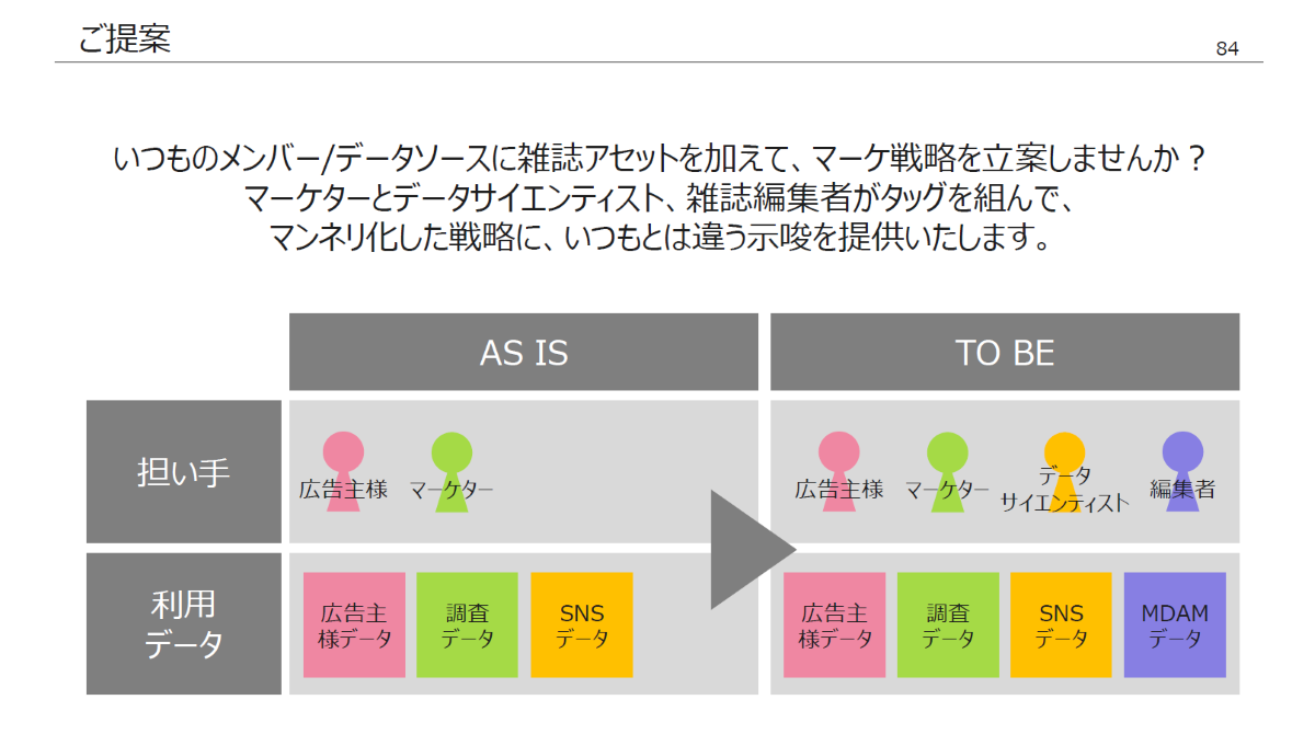 ほかにも、クライアントのオウンドメディアやSNSのアカウント、販促ツール、コミュニティといったお客様とのエンゲージを深める接点に、雑誌のコンテンツ力とMDAMのデータ活用の可能性が多いにあるのではないかと考えています。