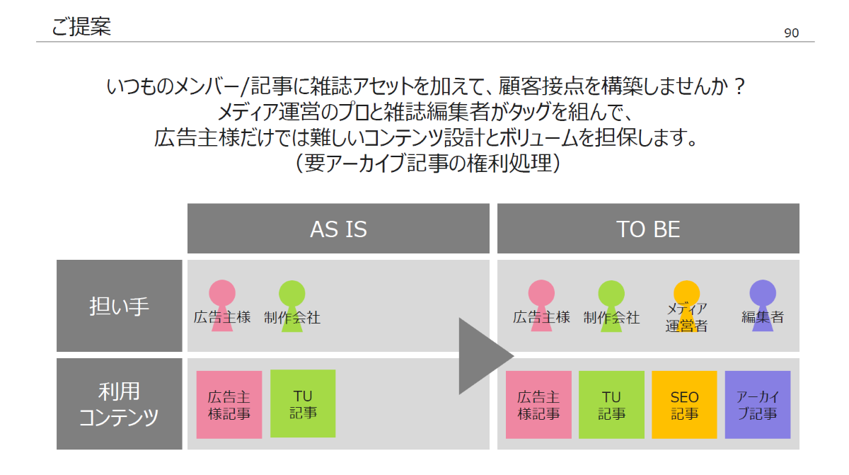 また、広告主と一緒に作るタイアップ記事はクオリティが高い一方で、こだわり抜いて作るためなかなか量産が難しいという課題があります。そこにMDAMのアーカイブコンテンツを活用することで、クライアントさんのオウンドメディアにもタイアップ記事を活用していくといったことも可能になるでしょう。さらには、オウンドメディアをつくっているクライアントと制作会社の中に、編集者自身が入ることで、メディアのグロースの部分まで見据えて、一つのチームとして継続的にクライアントのメディアを盛り上げていくといったやり方も、十分考えられると思います。