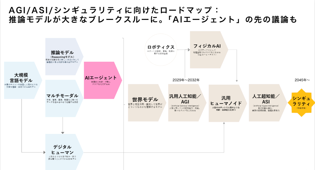 下図は我々が作成したシンギュラリティまでのAI技術ロードマップです。「大規模言語モデル」から始まり、昨年Open AIが発表した「推論モデル」、「マルチモーダル」が進み、それらの成果を受けて「デジタルヒューマン」が活発になっています。さらに推論モデルによって“考える”ということができるようになり、今年は「AIエージェント」が注目されています。そして次のアーキテクチャーとして「世界モデル」が議論され、その先にはAGIが控えています。また、ロボティクスを融合した「フィジカルAI」も迫っています。