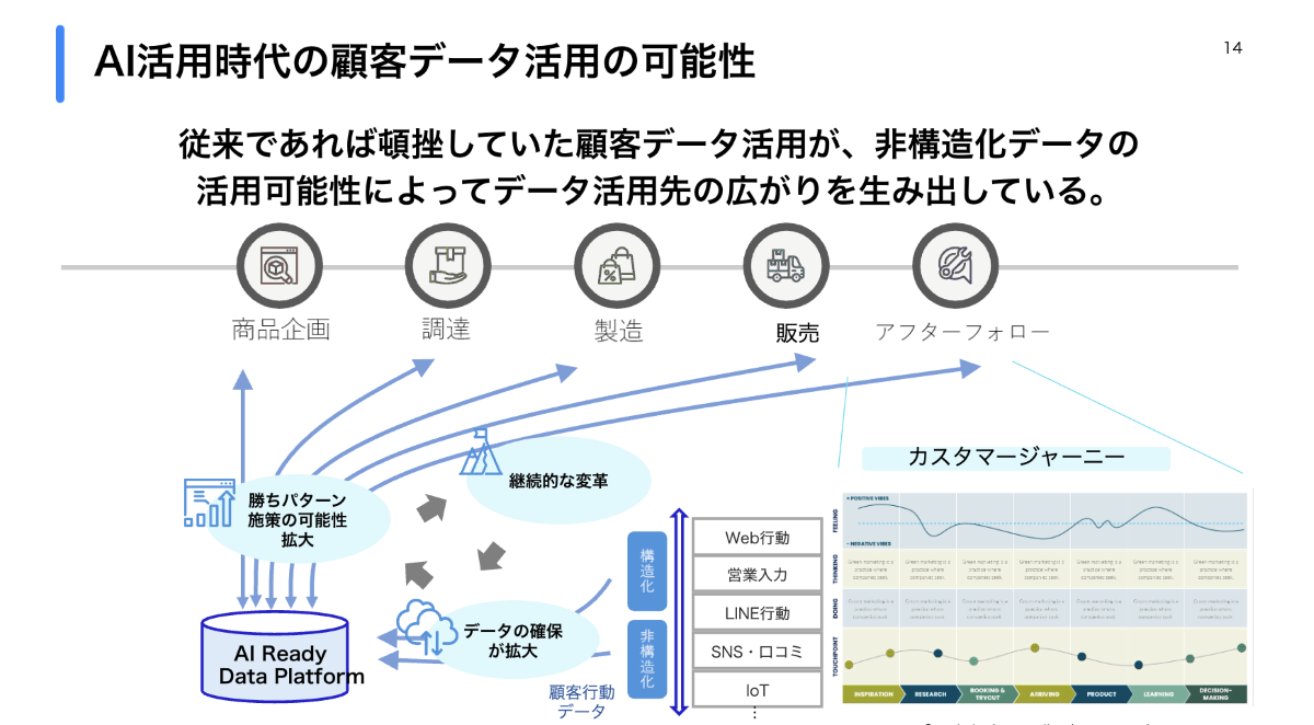 - AI活用の成功には「データ量・質の確保」「ユースケースの確立」「継続的な変革」が必要ですが、これらを実施するのは容易ではありません。さらに、AI活用において今後特に重要になるのが、「非構造化データ」の活用です。非構造化データとは、例えばコールセンターにおけるお客様とのやりとりの音声ログや、投稿されたクレームの画像、商談の動画など、これまで具体的な活用が難しかったデータのこと。AIの進化でこうしたデータ群も活用しやすくなり、例えば商品企画から調達、製造、販売、アフターフォローまで、マーケティング活動だけでなくあらゆる業務プロセスで活用が期待されています。これまでは「データを貯める」ことが目的になりがちでしたが、これからはAIとデータを常に行き来しながら、継続的に価値を生み出していく時代になるでしょう。