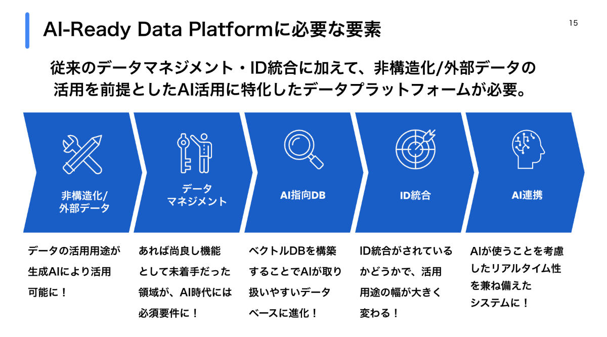 そして最後に、AI-Readyなデータ基盤を整備します。注意いただきたいのは、これさえ入れればOKという夢のようなツールがあるわけではありません。それぞれの課題やデータ構造に応じて、必要な要素を組み合わせて設計する必要があります。その際に重要な要素は、
