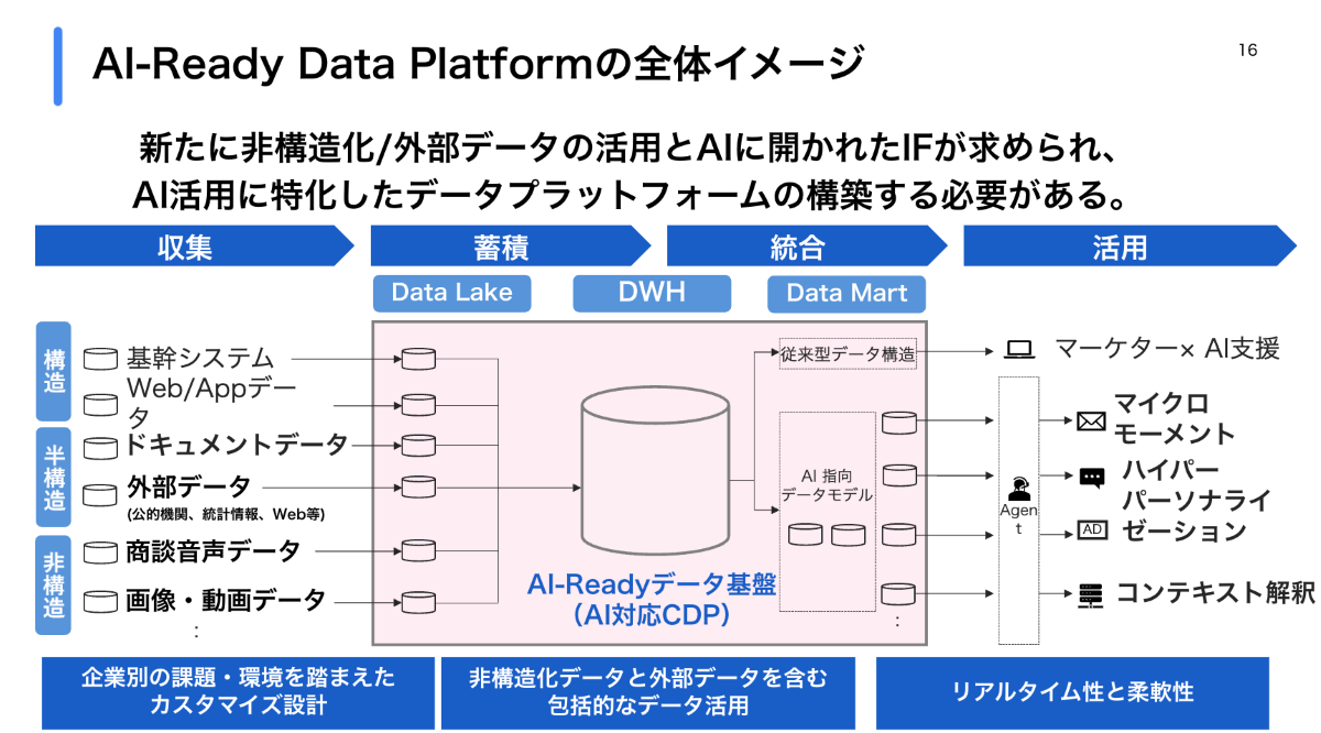 売上データのような構造化データだけでなく、商談ログやクレーム画像といった非構造化データもすべて投入し、それらを統合的に処理できるデータ基盤を構築する。そして、そのアウトプットを、ハイパーパーソナライゼーションのような高度な顧客コミュニケーションにリアルタイムで繋げていく。これが我々の考えるAI-Readyなデータ基盤の全体像です。