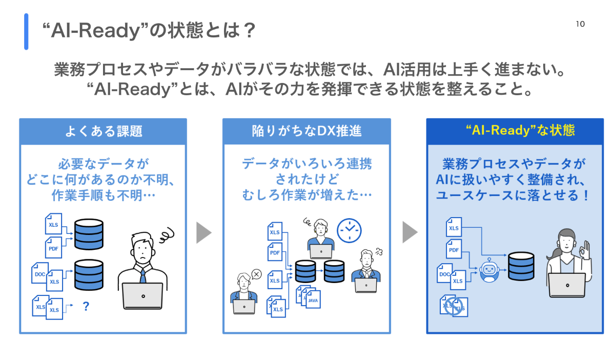 - 業務プロセスやデータがバラバラな状態では、AIの本来の力を発揮できません。そこで我々が提唱しているのが「AI-Ready」という考え方です。AI-Readyとは、「業務プロセスやデータについて、AIがその力を最大限に発揮できる状態に整えること」と定義しています。業務やデータをAIが扱いやすくなることで、企業が本当にやりたいこと、つまり具体的なユースケースにスムーズに落とし込めるようになるのです。