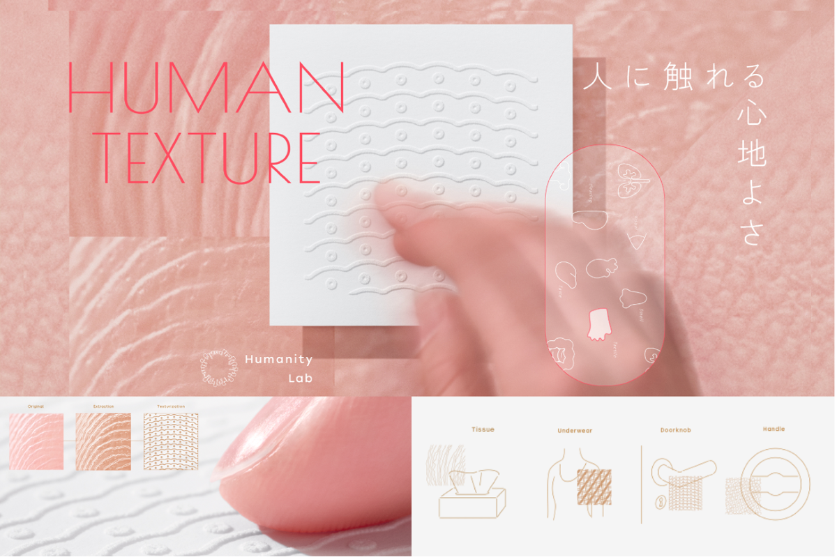 そこで、私たちは『人間の皮膚』に着目し、『人間の皮膚のテクスチャーを拡張することで、心豊かな触り心地をつくることができるのではないか』という仮説のもと、人間の皮膚を何十カ所も撮影し、そのなかで特徴的な部位をテクスチャーとして取得、5種類のテクスチャーのパターンを作り、HUMAN TEXTUREとして公開しました。