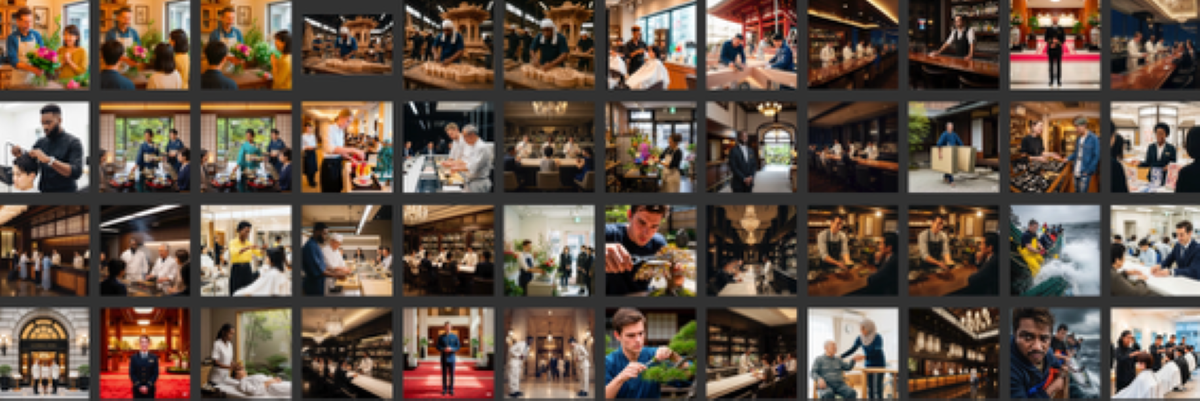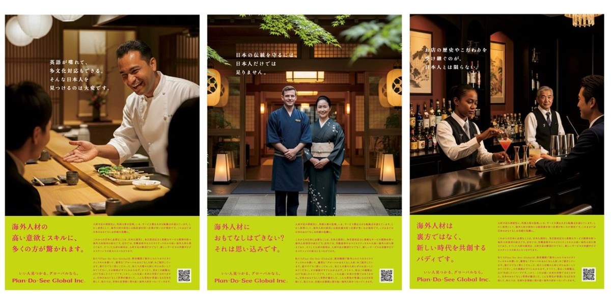 - 日本企業に有能な海外人材を派遣するサービスで、多様なシチュエーションに、さまざまな人種のモデルを組み合わせることでビジュアル表現を行いました。600種類の組み合わせを生成し、検証を重ねて、最終的に3ビジュアルを選定。これは生成AIだからできることですよね。