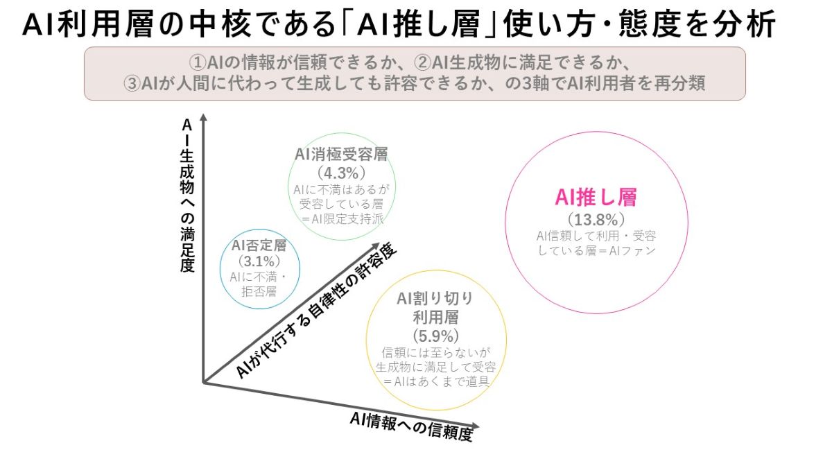 AI利用者を「情報信頼度」「生成物満足度」「代行許容度」の3軸で再分類したところ、最も大きな層はAIを信頼し積極的に利用する「AI推し層」でした。