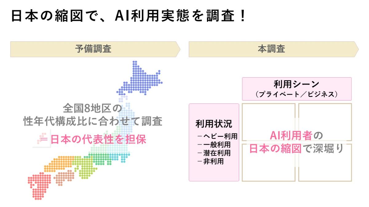 その中から2400サンプルを本調査とし、利用シーン(プライベート/ビジネス)と利用状況(ヘビー/一般)の2軸で、AI利用者の実態を深掘りしました。
