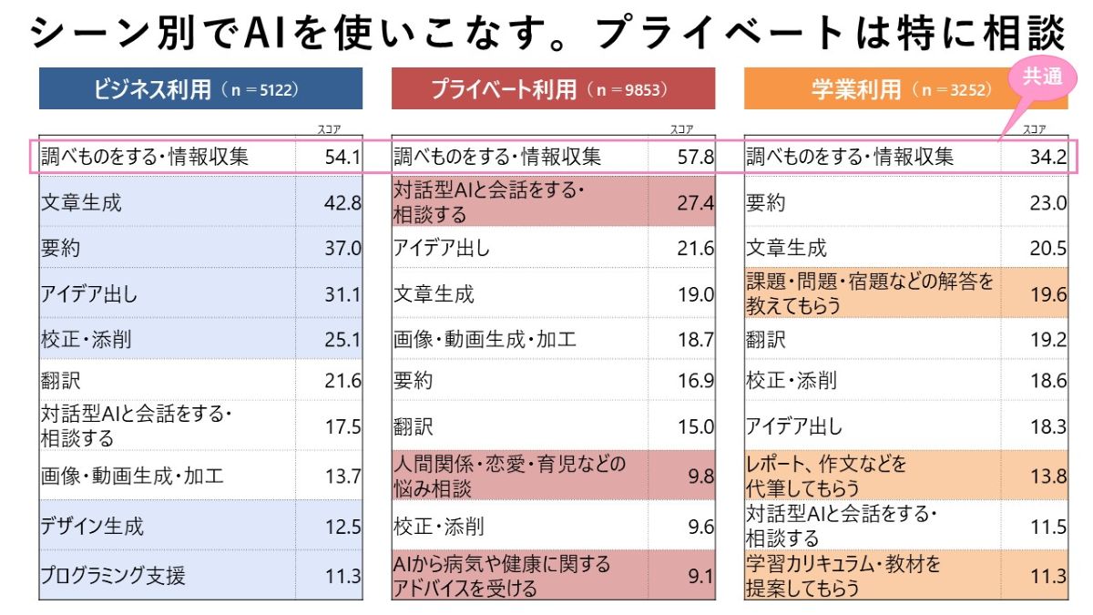 具体的な使い方としては、ビジネス、プライベート、学業のいずれのシーンでも「調べ物・情報収集」が共通してトップでした。しかし、2番目以降は用途が分かれます。ビジネスでは「文章生成・要約」「アイデア出し」、プライベートでは「対話型AIとの会話・相談」、学業では「宿題の回答」や「レポートの代筆」といった使われ方が見られました。特にプライベートでは、人間関係や恋愛、育児といった悩みを相談する相手としてAIが活用されているのが特徴的です。