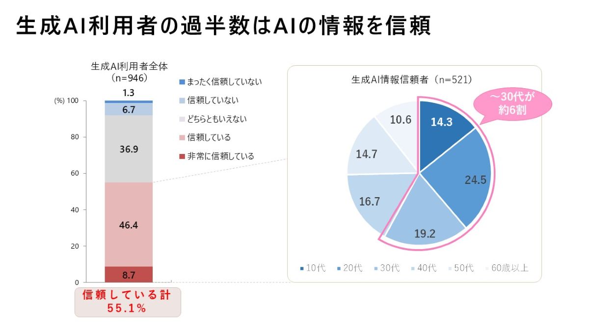 まず、AIが生成する情報の信頼度について尋ねたところ、利用者の55%が「信頼している」と回答しました。これは私が思っていたよりも高い数字です。特に10代から30代の若年層では6割を超えており、若い人ほどAIを信頼している傾向が見られます。