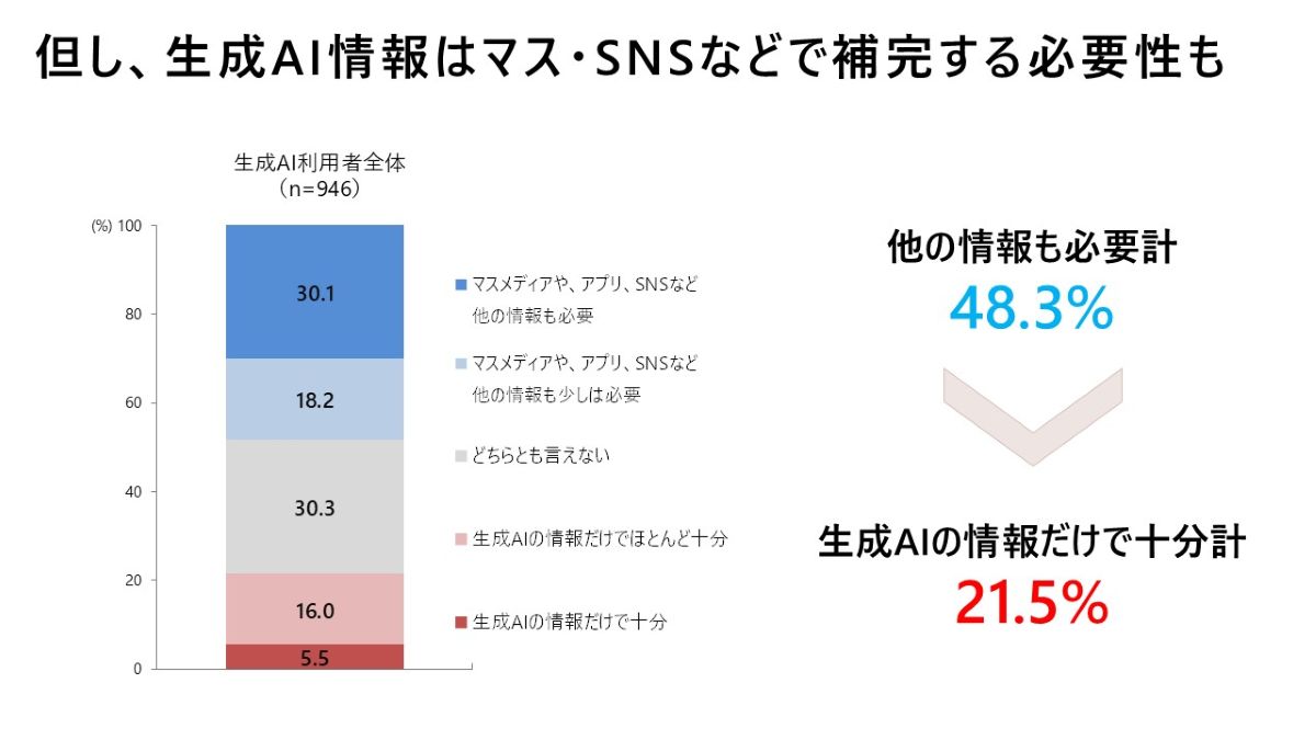 ただ、AIの情報だけで十分かと聞くと、そうではありません。「マスメディアやSNSなど他の情報も必要」と考える人が5割弱おり、まだまだ情報の補完が必要だと生活者は感じています。