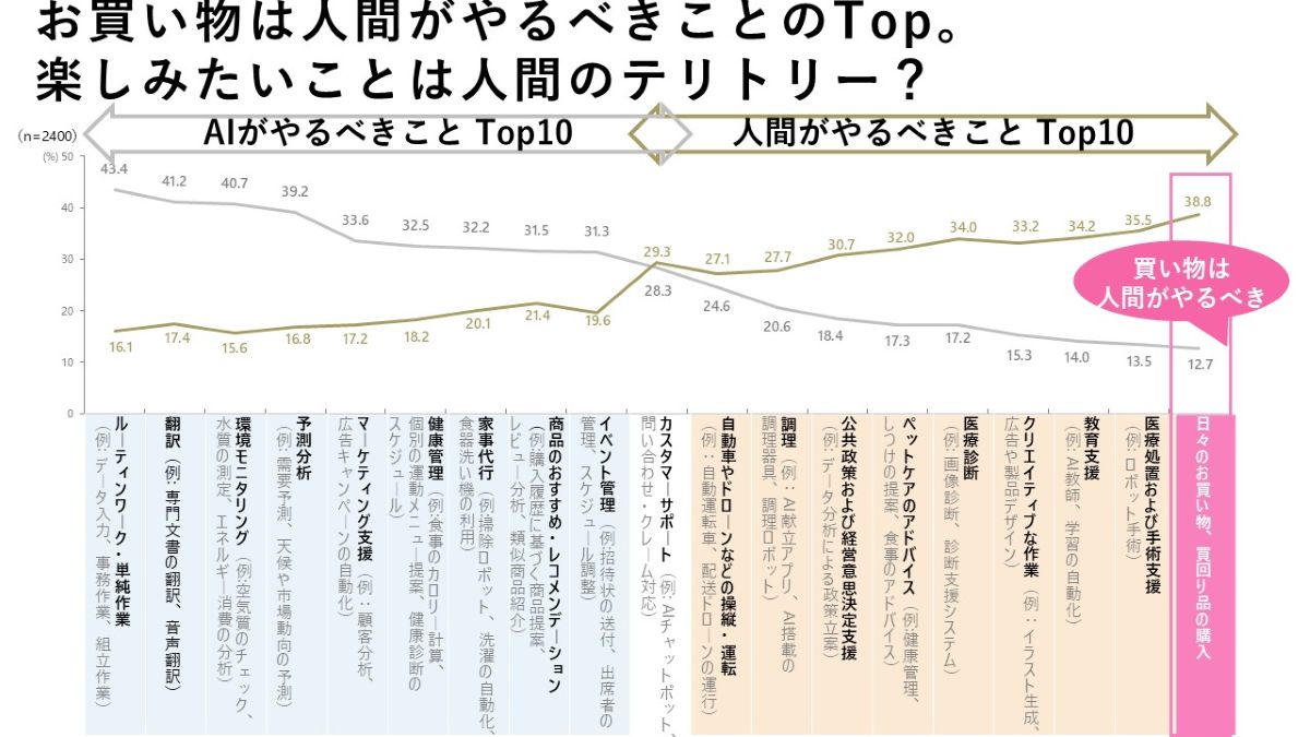 さまざまな行動の中で「AIがやるべきこと」と「人間がやるべきこと」を分けてもらったところ、「人間がやるべきこと」のトップは「日々のお買い物」でした。情報収集や比較検討はAIに任せても、最終的な購入の楽しみは人間が担いたい、という意識が強いのかもしれません。