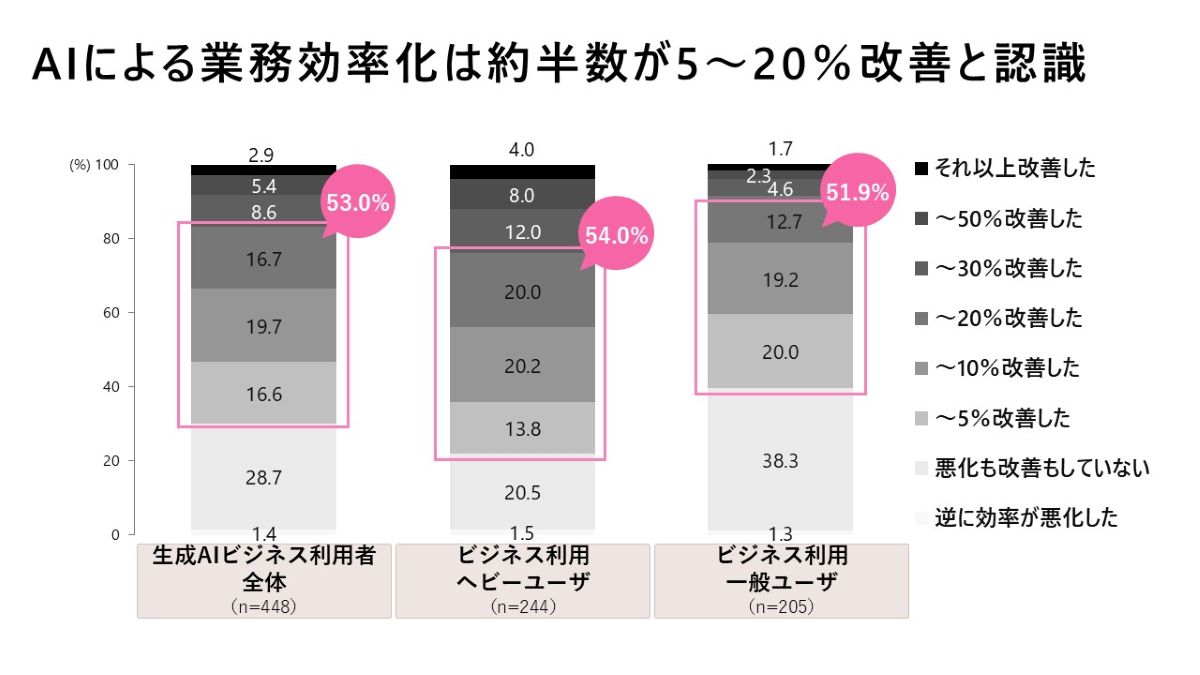 業務効率化に関しても、ビジネス利用者の約半数が「5%から20%程度改善した」と回答しており、AIの導入効果を主観的に実感している人が多いことがわかりました。