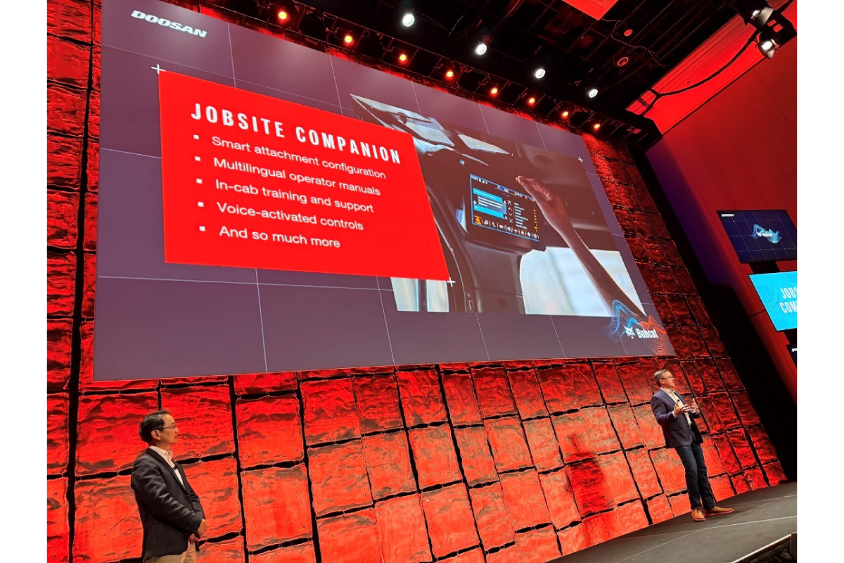その中心に据えられたのが、同社の説明ではコンパクト建機領域で“初”のAI音声操作として紹介された Bobcat Jobsite Companion です。オペレーターは機械に向かって話しかけ、作業意図を伝え、設定や操作について質問できます。たとえば、重機の腕の先に取り付けたアタッチメント(土をすくうショベルや、岩を砕くハンマーなどの交換器具)に対して「どの設定が適切か分からない」という場面では、Jobsite Companionがその道具の種類と作業環境に合わせて機械の設定を最適化すると説明されました。そしてステージ上で同社は、音声コマンドによって50以上の自動化操作(engine speed、油圧モード、ライト、ラジオ等を含む)を起動できると明言しています。つまり「手はレバーに置いたまま、口で機械を動かす」未来を、デモとして見せました。